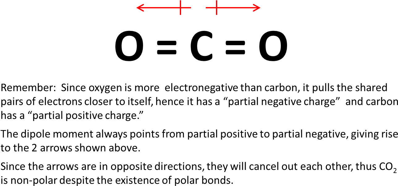 Since carbon and oxygen have different electronegativities the electrons are not shared equally between the two atoms. The two oxygen atoms in either direction of the carbon atom pull the electron density equally from both sides. The electrons in each of the double bonds are drawn toward the oxygens so both oxygen atoms have a partial negative charge. Examples of non-polar bonded molecules.
